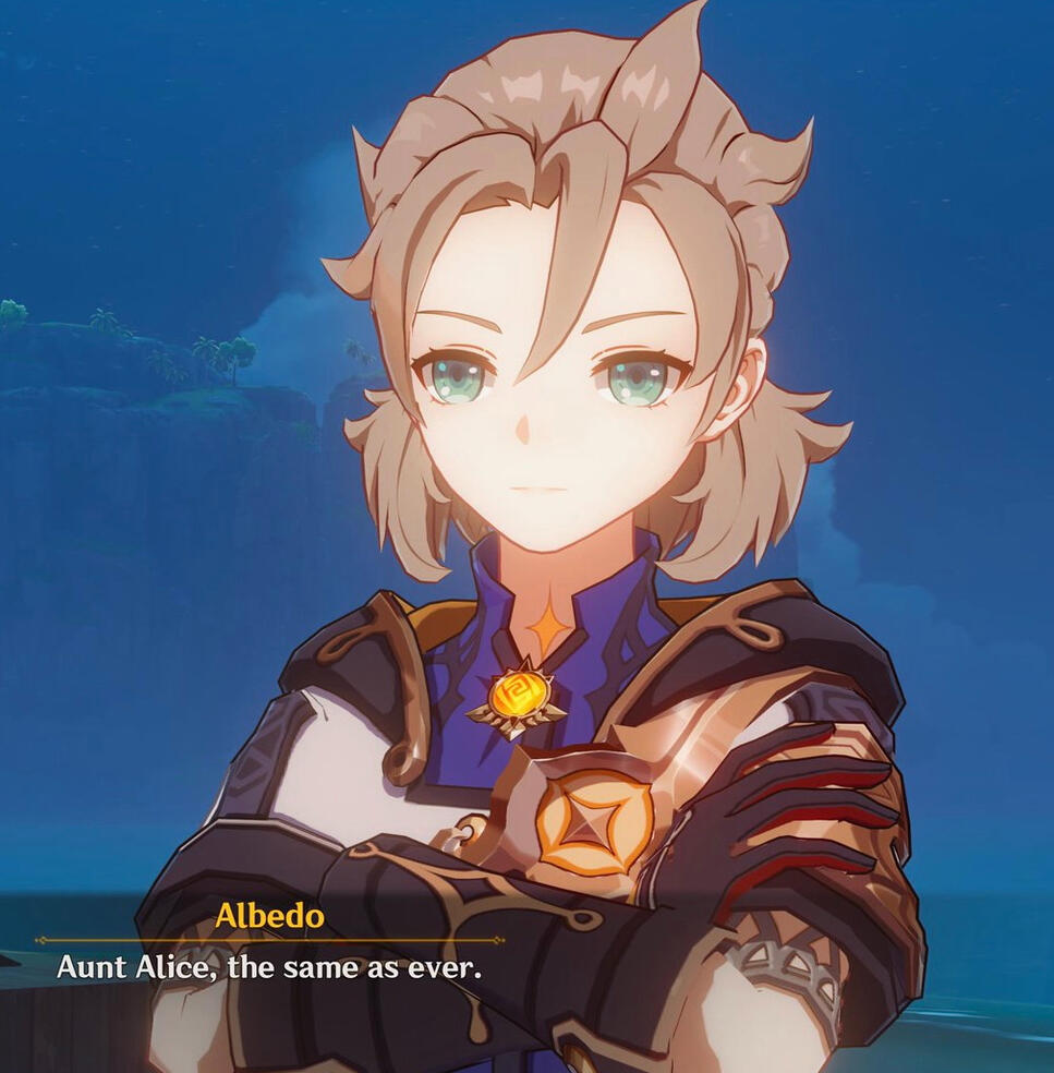 Albedo seems to be the type that’s hard to track down- being the captain of the Investigation team, he’s usually off somewhere (namely Dragonspine) on his own, which creates a general mystery about who he is as a person -And who is Albedo, really?It is heavily implied he was created through alchemy by his master, Rhinedottir (a friend of Alice, aka Klee’s mother). It’s stated she is not his birth mother, but that he’s been adventuring with her since he was born.His earliest memories are of training and travelling with his master. We are not given too much info on her, other than she taught Albedo alchemy that originated in Khaenri’ah, and that she was a strict and cold woman who gave him many assignments.When he woke one day, his master was gone and he was left with a task from her: to discover the truth and meaning of this world. Only then would she return.She also (in a note) told him to go to Mondstadt, where Alice was and she would basically vouch for Albedo and take him in. Seeing how Alice is a renowned (& dangerous) sorceress, others didn’t question Albedo’s ability. (She has also wanted Albedo to call her mom, but he doesn’t really see her that way, from what his voice lines imply.) In his story line it says KOF work only takes up 5% of his energy..