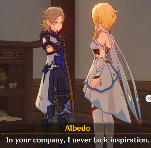 It’s obvious that Albedo is an introvert, and he’s not close with many characters. Sucrose is his assistant and also an alchemist. She seems to have a crush and speaks highly of him as her mentor. Albedo supports her alchemical endeavors. I’m not sure the feelings are mutual (no hate to the ship), mostly because social relationships of any sort are seen as complicated effort to Albedo (lol). I think he just doesn’t want to hurt feelings while he’s off focused on his experiments/investigations.He considers Klee his little sister, and it’s very cute. Timaeus is also Albedo’s assistant. Sucrose and Timaeus drive the point home that Albedo is a genius and what takes them weeks to figure out, he can do in moments.Other characters seem to be .. intrigued by the mystery of Albedo.